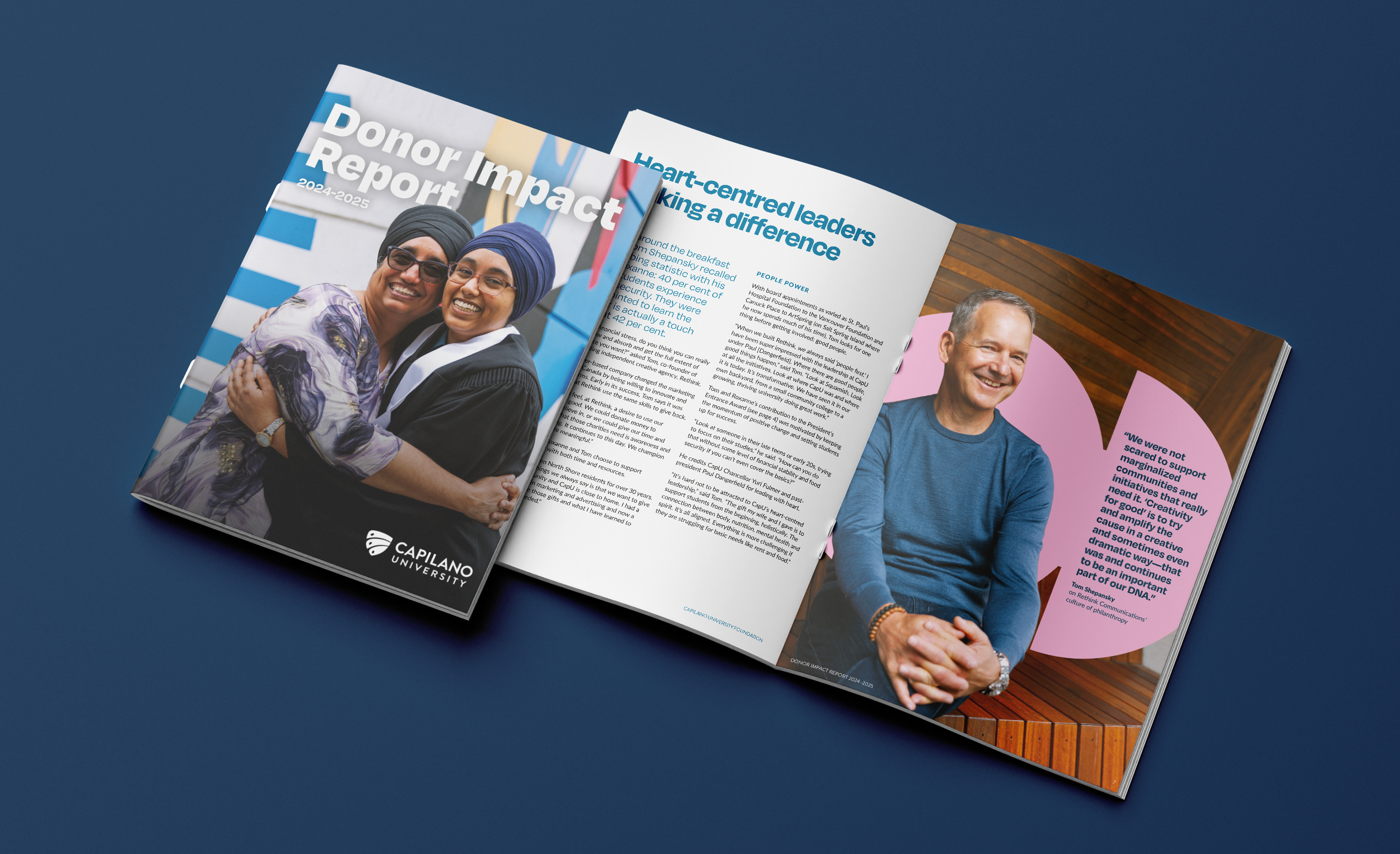 I was thrilled to be able to support the Capilano University team with design of their Donor Impact Report for 3 years in a row. We were able to create an impactful publication using the brands strong colour palette and images to help bring the donor stories to life. Design of little badges for call outs added playful a way to navigate the document. Large feature quotes and infographics helped to communicate at a glance the impact the donors have on students. We also created a data merged document that was unique to each donor reporting on specific funds.